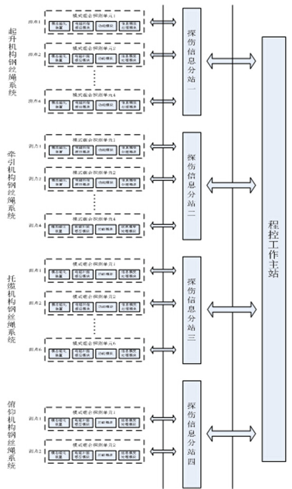 該系統(tǒng)分為模式組合探測單元、探傷信息分站和程控工作主站(設險情狀態(tài)預報警機制)三大部分,各部分均定點安裝。