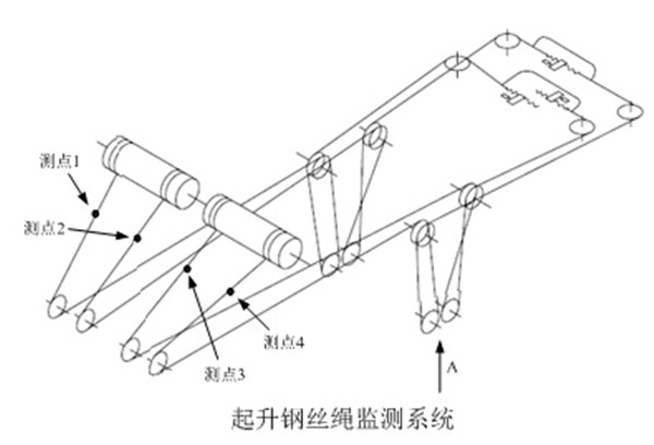 作為岸橋起重機結構重要的起升機構,其鋼絲繩系統(tǒng)共布置了4個測點,示意圖如下: