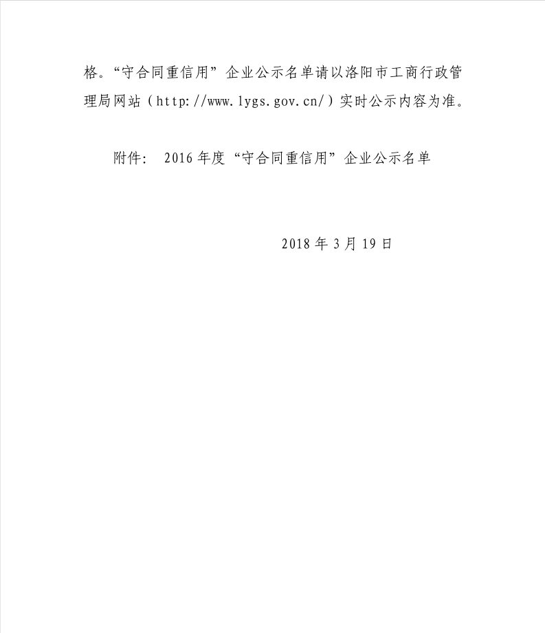 更多請(qǐng)點(diǎn)擊近期在洛陽(yáng)市工商行政管理局公示的“2016年守合同重信用企業(yè)”名單中,我公司名列其中,同時(shí)還獲得了省守重企業(yè)稱(chēng)號(hào)。