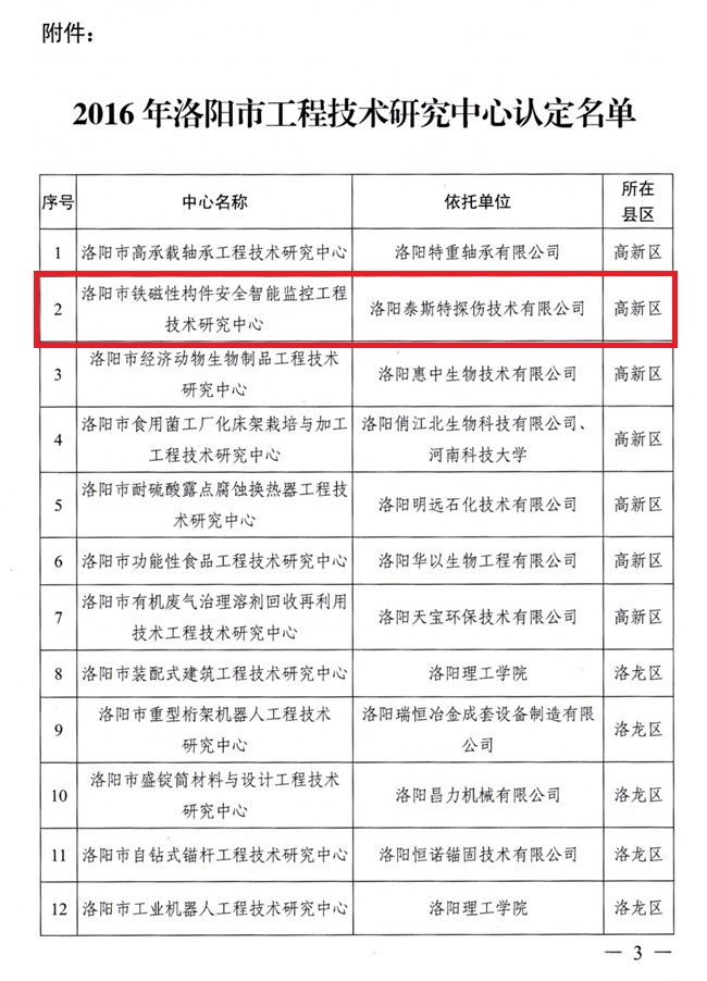 根據(jù)《洛陽(yáng)市工程技術(shù)研究中心管理辦法》(洛市科【2006】95號(hào))規(guī)定,經(jīng)組織申報(bào)、初審、現(xiàn)場(chǎng)考察、會(huì)議評(píng)審等評(píng)審程序,洛陽(yáng)泰斯探傷技術(shù)有限公司被認(rèn)定為洛陽(yáng)市鐵磁性構(gòu)件安智能監(jiān)控工程技術(shù)研究中心。