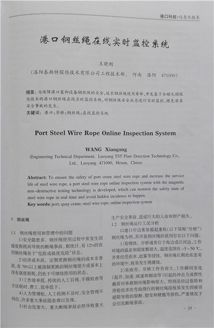 隨著公司新市場開拓不斷深入,市場反響逐漸升溫,尤其是面對港口行業(yè)對鋼絲繩安全問題關(guān)注度和解決方案渴求的急劇提升,針對港口行業(yè)的特殊工況環(huán)境和安規(guī)范要求,我公司和某港口達成戰(zhàn)略合作伙伴友好關(guān)系,為該港現(xiàn)場各類提升設(shè)備鋼絲繩提供安全監(jiān)測方案。豐富完備的港口現(xiàn)場數(shù)據(jù)和行業(yè)的鋼絲繩磁檢測技術(shù)結(jié)合成系列港口用鋼絲繩在線實時智能監(jiān)測系統(tǒng)。為了推而廣之向更多港口客戶提供TST產(chǎn)品保障安全的科技力量,同時也為了讓港口客戶對TST產(chǎn)品及技術(shù)方案在港口適用性有充分詳細的了解,TST 公司在港口行業(yè)權(quán)威性期刊《港口科技》2016年3月刊出《港口鋼絲繩在線實時監(jiān)控系統(tǒng)》論文。